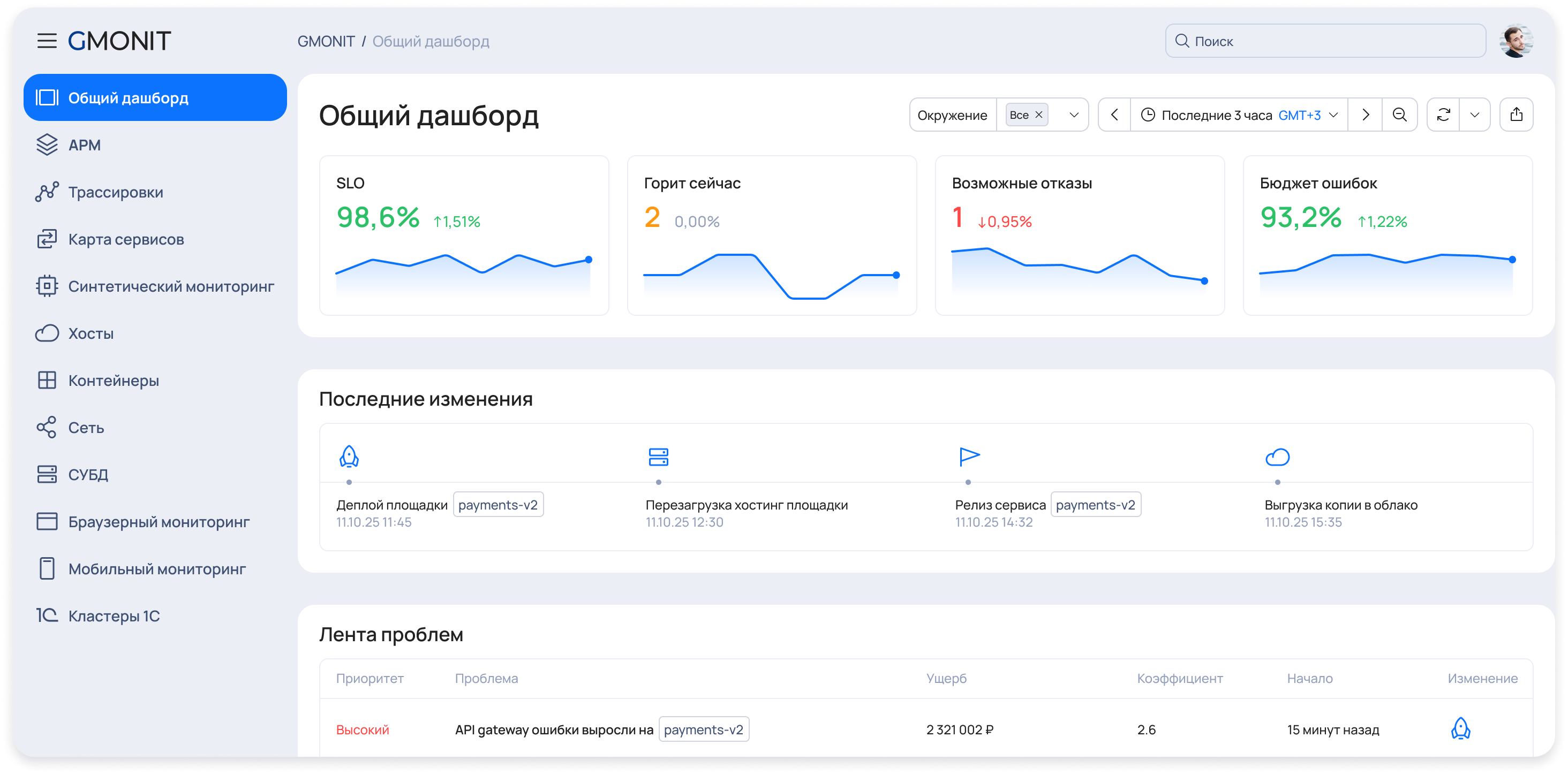 Перед нами стояли три задачи: узнавать о проблемах раньше, чем об этом сообщают пользователи, сократить время расследования инцидентов для группы поддержки и снизить влияние тех. сбоев на важнейшие бизнес-показатели. Опытным путем мы убедились в эффективности GMonit. Платформа обеспечивает бесперебойную работу помощью комплексного мониторинга производительности наших приложений, инфраструктуры и пользовательского опыта.