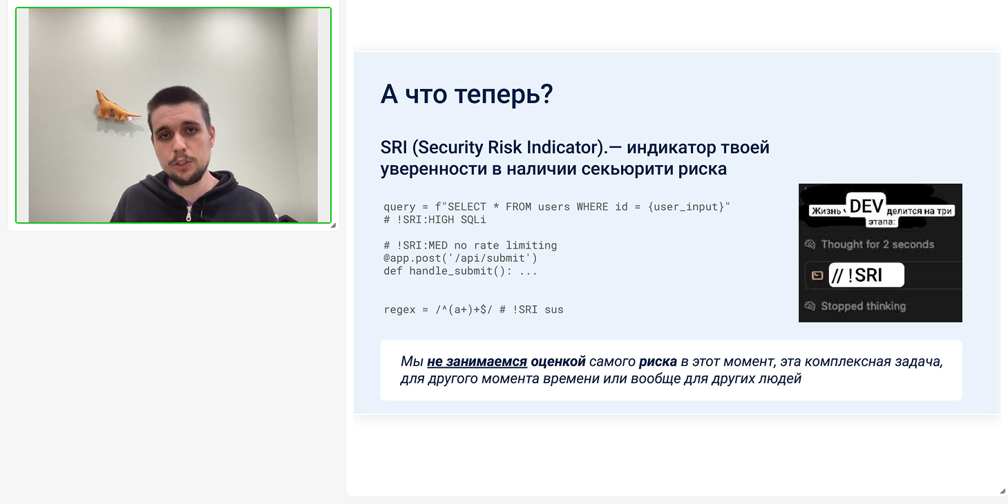 Также спикер рассказал про 10 рэд флагов в процессе разработки — действиях ИТ-специалистов, которые приводят к узким местам в ПО. Юрий предложил использовать подход SRI (Security Risk Indicator) — индикатор уверенности в наличии рисков безопасности.