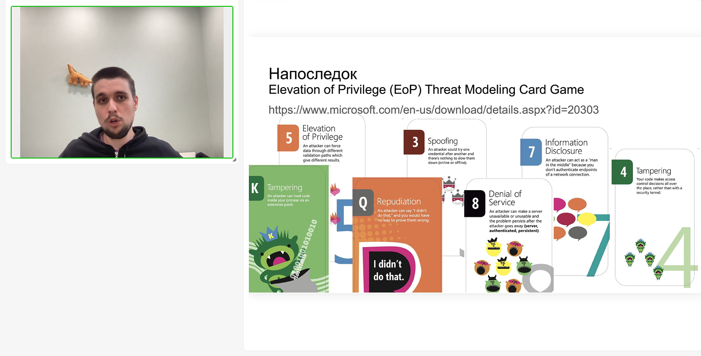 В завершении онлайн-мероприятия предложил разработчикам настольную игру «Elevation of Privilege (EoP) Threat Modeling Card Game» от Microsoft, которая помогает в игровой форме отрабатывать навыки моделирования угроз.