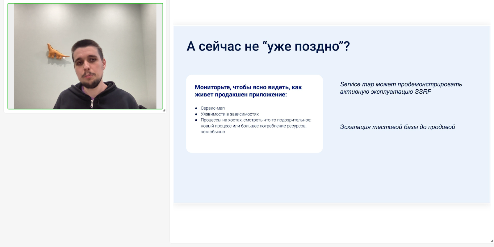 Зрители трансляции услышали, насколько важен постоянный мониторингприложений для раннего выявления угроз. В качестве средств защиты привел:
